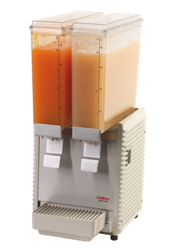 This Crathco Mini Twin E29-3 2.4 gallon double bowl cold beverage dispenser is a simple and effective way to boost impulse sales at your snack bar, buffet, or fast food restaurant. Has plastic side panels and drip tray.