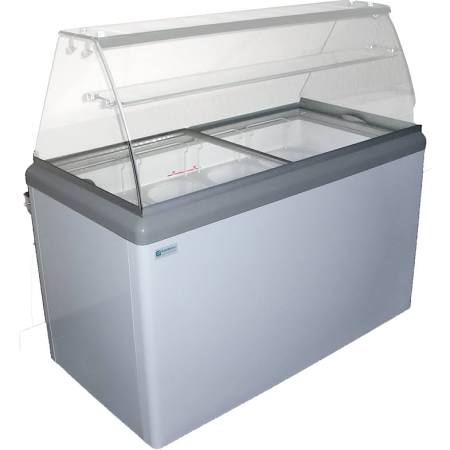 The Excellence Ice Cream Dipping Cabinet includes a wide range thermostat, LED interior lighting, cold wall evaporator, prepainted galvanized steel interior and single layer heat reflective glass lids. Assembly required.